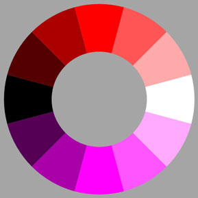 Ungestraft dürfen wir deshalb auch einen Gothic-Farbkreis entwerfen, basierend auf willkürlichen Gegenfarbpaaren Schwarz-Weiss und Rot-Violett. Wozu soll dieser Farbkreis gut sein? Er dient einzig dazu, den Herrn Küppers zu ärgern.
