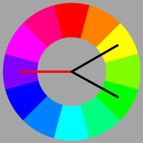 Im wesentlichen handelt es sich dabei um einen Komplementärkontrast, dessen einer Pol aufgegliedert wurde auf die beiden neben liegenden Farben. Statt einer Aufgliederung kann es sich dabei auch um einen Farbverlauf handeln. Die Farben an den Eckpunkten der kurzen Dreieckseite bilden dann eine Komposition in verwandten Farben und die dritte Farbe stellt als farblicher Ausgleich ein Kontrapunkt dar.