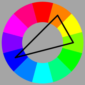 Dieser Harmonische Dreiklang ist ein Farbe an sich Kontrast. Er mag richtig sein für ein schreiendes Bild oder wenn es darum geht, Zeilen oder Spalten einer Tabelle gegeneinander abzugrenzen, wenn also eine klare Unterscheidbarkeit gewünscht ist.
