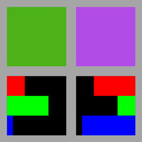 Die nebenstehende Grafik soll dies verdeutlichen: In der oberen Zeile dargestellt sind zwei zueinander komplementäre Farben, beide sind in diesem Beispiel nicht reinbunt, d.h. beide enthalten von allen Farbkomponenten Anteile.