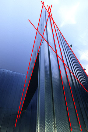 Sobald Sie die Kamera nicht mehr waagrecht halten wird auch die letzte verbliebene Dimension Fluchtlinien zeigen, das Bild wird 3 Fluchtpunkte aufweisen. Bei nach oben gerichteter Kamera scheint das Bild nach hinten zu kippen respektive nach vorne wenn Sie die Kamera nach unten richten. Die senkrechten Linien werden zu sogenannten stürzende Linien. Ob das Motiv durch stürzende Linien einen dynamischen Aspekt kriegt oder ob diese als empfundenen Fehler auftreten hängt stark vom Motiv ab. Für Architekturaufnahmen sind zwei Fluchtpunkte, je einer für die Tiefe und die Breite ideal, stürzende Linien werden nicht so gerne gesehen.